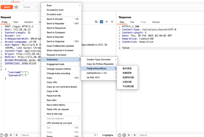 部分情况下想对单一某个数据包进行漏洞验证或其他原因,可以在repeater右键选择对应插件选择扫描或探测