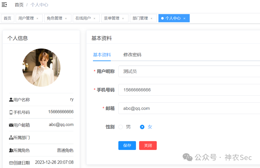 但是这个web端是需要使用手机号和密码进行登录的,所以平常使用的那两个弱口令也就没用了,但是经常碰若依系统的就知道,进入后台以后,里面一般会经常留有一个测试账号和测试手机号,可以给师傅们看看若依系统的后台用户管理界面: