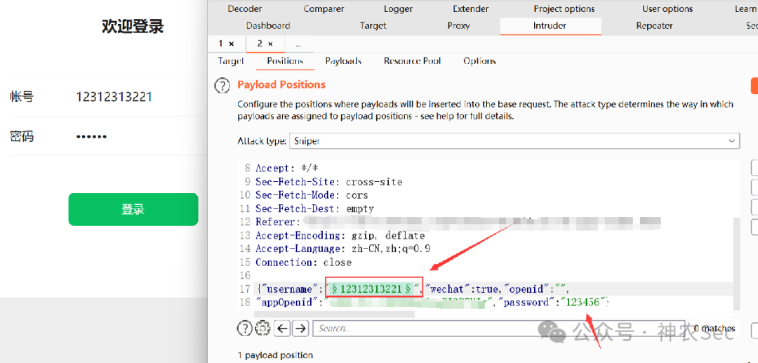 然后抓包,通过bp的爆破功能模块进行尝试爆破他的用户名,密码我们这里直接使用123456,因为这种学校网站存在这样的123456的弱口令很正常,目前要做的就是爆破用户名也就是手机号了
