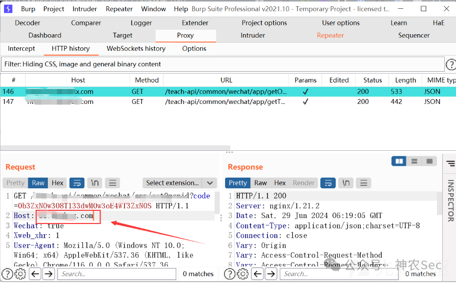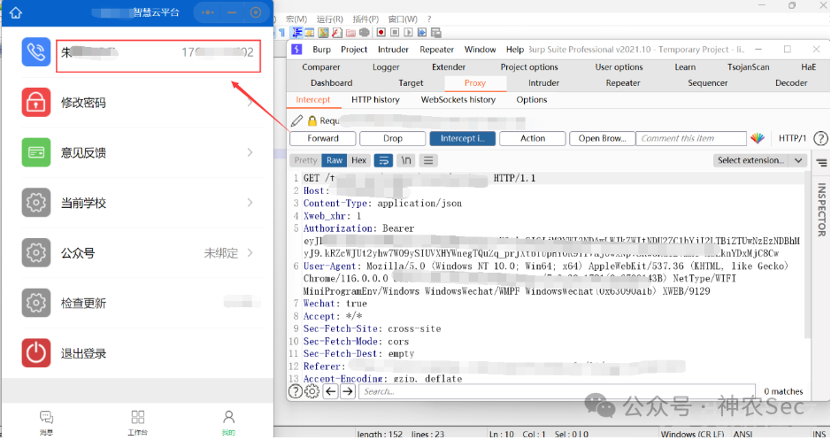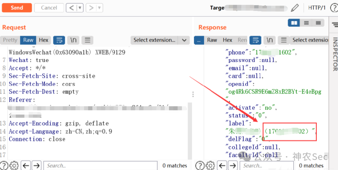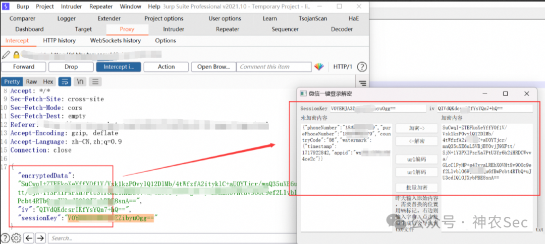 那么现在尝试把Wx_SessionKey_crypt里面我的手机号改成17开头朱老师的手机号,然后再利用上面的工具进行加密,再替换上面bp里面的数据包,就可以成功登录了