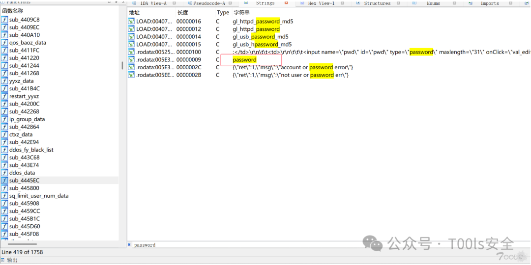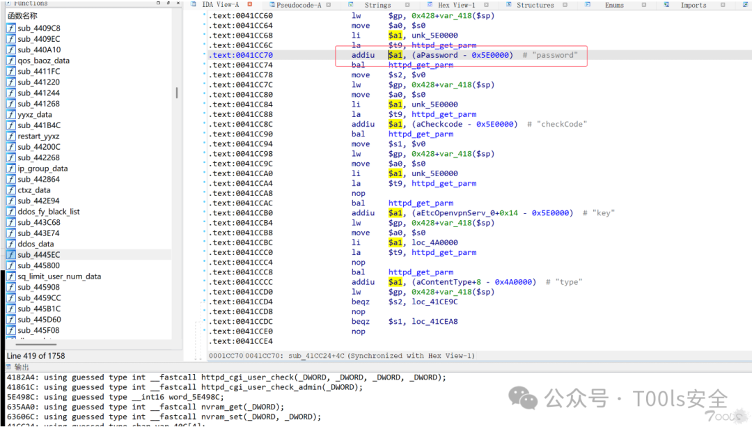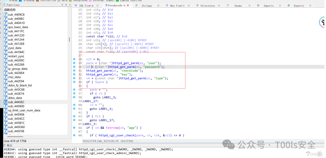 然后就能找到带有password字符串的函数,F5一下,很明显sub_4445EC函数就是处理登录逻辑的函数,也就是数据包当中的login.cgi。