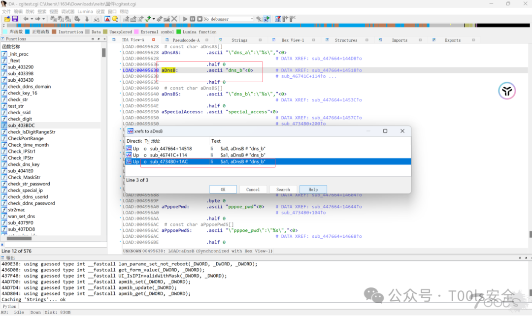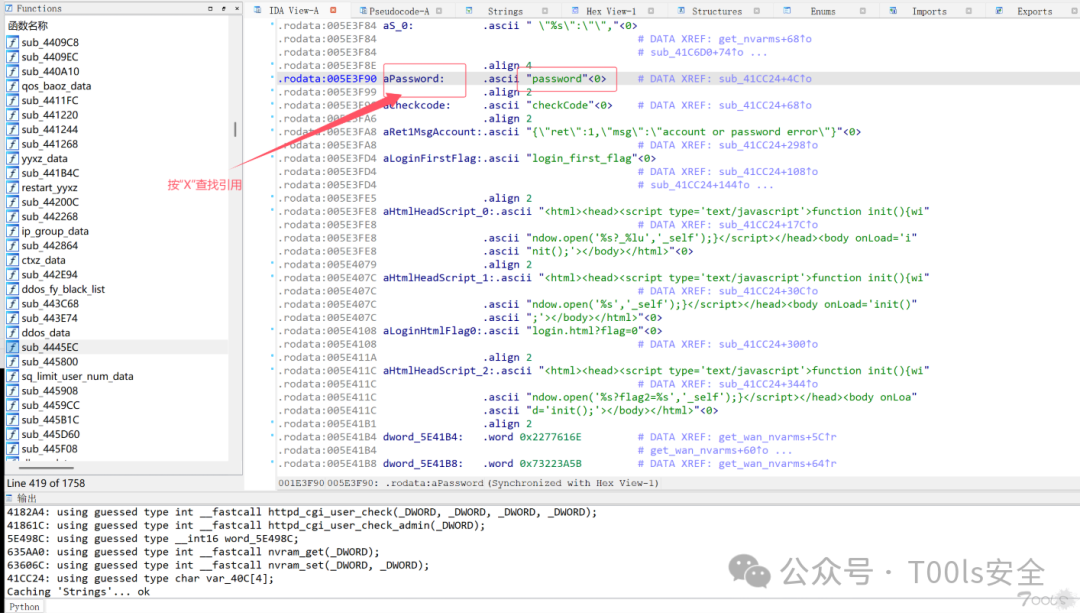 • IDA用于分析固件的漏洞点;需要掌握IDA的一些基本使用。字符串查找、函数查找、交叉引用等。