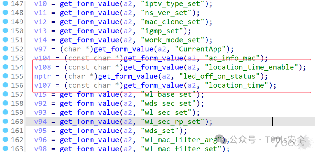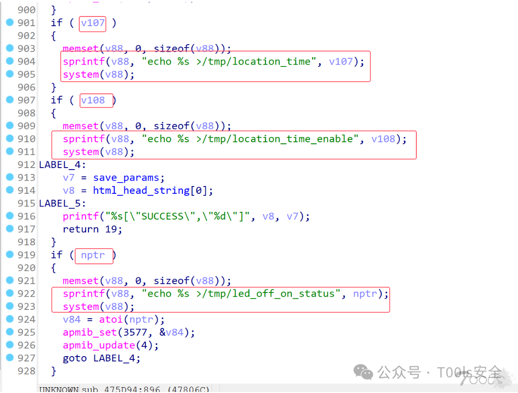 审计之后发现,sub_403BDC函数当中,location_time_enable、led_off_on_status、location_time,这三个参数从前端(netcore_set.cgi)传入,传入之后没有进行过滤等操作,通过sprintf函数进行格式化处理之后,直接使用system函数执行,导致了命令执行漏洞。