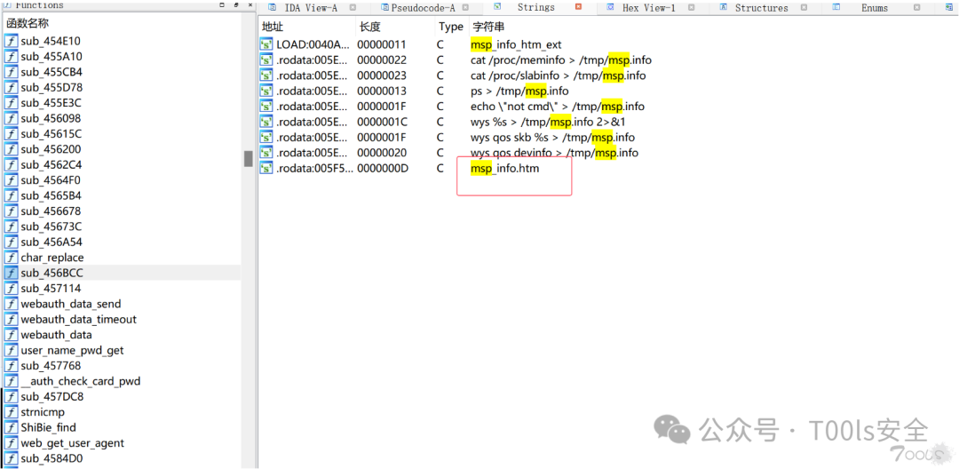 确实找到了RCE的点,但是符号表被去掉了;无法直接判断出是从那个接口传进来的参数。这时候就需要去看函数当中的的关键词了。例如上述的关键词为“msp”,那么可以进行关键词查找,发现msp_info.htm,然后直接构造参数。直接就开始找设备测试。其实有时候实在是关键词找不到接口的时候,可以直接去rodata段寻找所有的接口名称,找个感觉差不多的试一下,大不了就都试完呗。