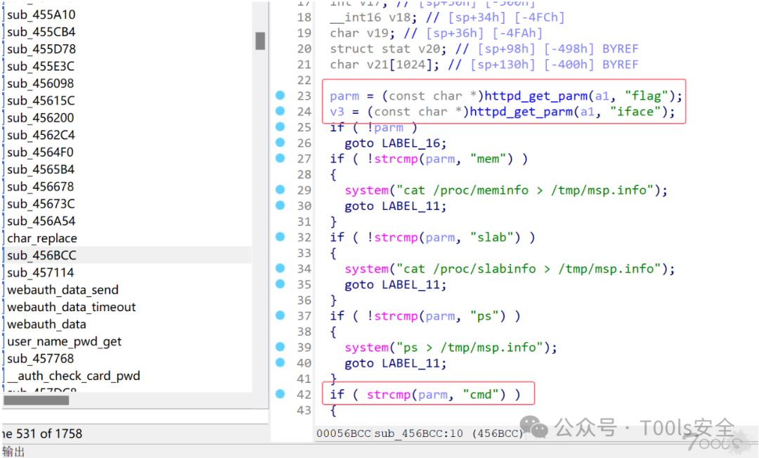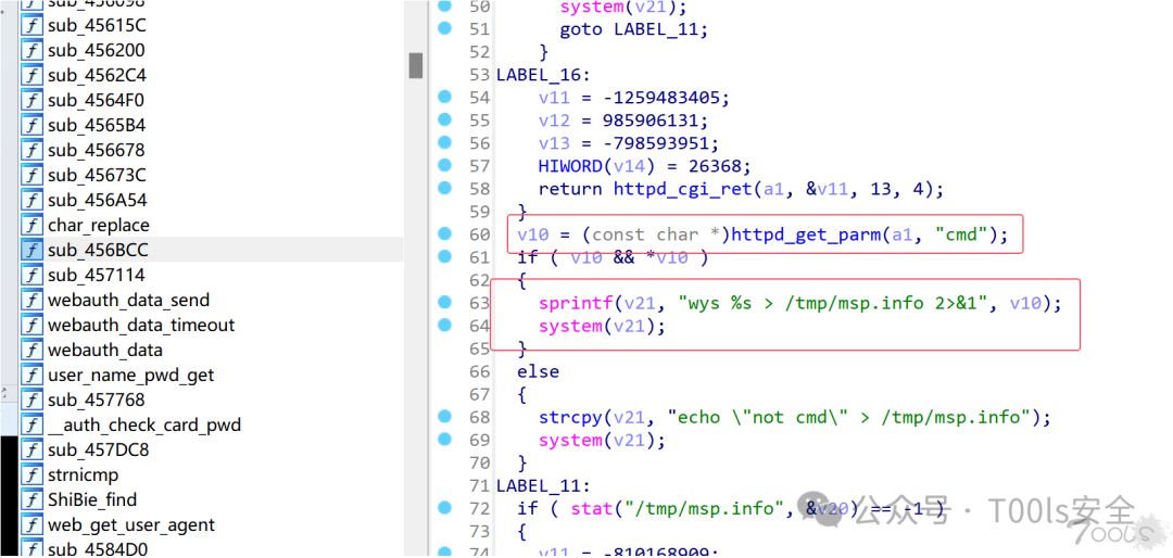 查找危险函数system,IDA交叉引用,查找存在漏洞的函数。搜索之后发现sub_456BCC函数存在RCE。前端传入的flag的值给到parm。判断parm是否等于cmd,parm的值等于cmd之后,前端会将传入的cmd的值给到V10,然后将V10的值通过sprintf函数进行格式化处理,并将格式化后的字符串通过system函数执行,最后构造命令达到RCE的效果;
