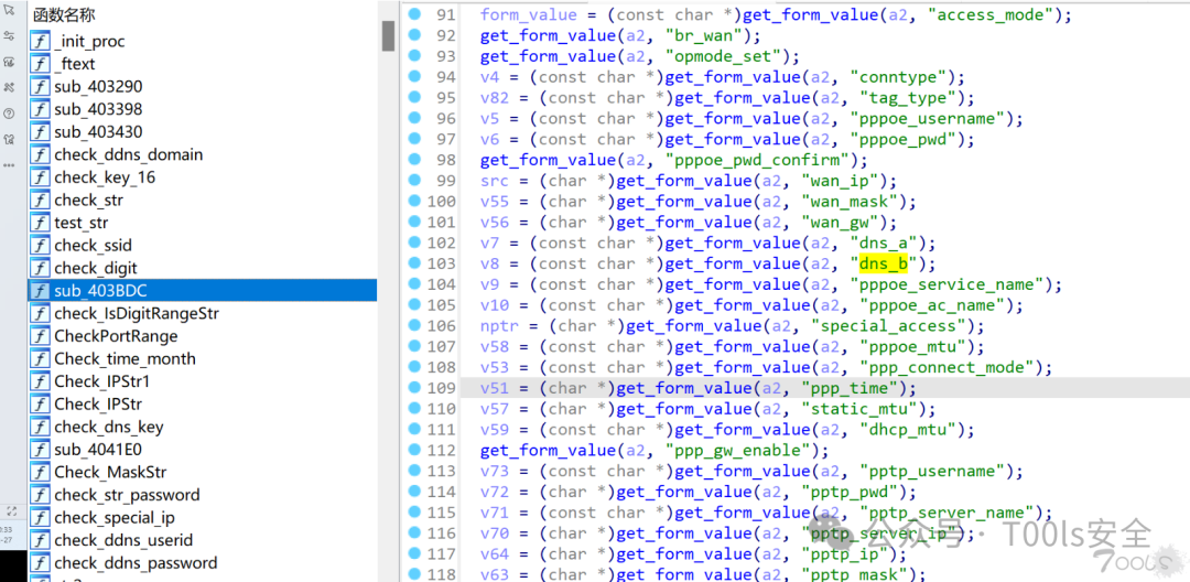 根据数据包当中的参数dns_b,在IDA搜索字符串,然后找字符串被sub_403BDC这个函数引用。通过查找看到sub_403BDC这个函数对web传入的很多参数都进行了处理。