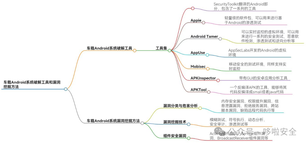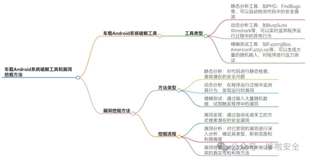 针对车载Android系统破解工具及漏洞挖掘方法的系统性总结,结合当前主流技术实践与安全研究,分工具分类、漏洞挖掘方法及风险注意事项三部分进行阐述: