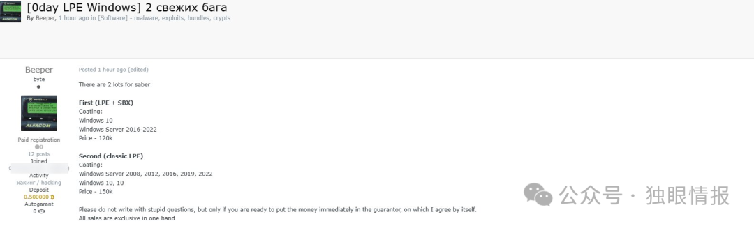 3.威胁行为者声称正在出售两个 0day LPE(本地提权) 漏洞
