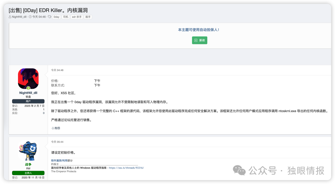 有恶意行为者在 xss论坛上售卖0day漏洞,可以无视 edr 检测,并将其关闭。该恶意行为者没详细描述使用效果,推测是这样,不然怎么能叫 edr杀手捏?