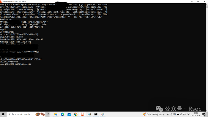 curl -s https://app.site.com/config.js | \grep -E “environment: ‘Production’|storageUrl: ‘https://buildxact.blob.core.windows.net/'|googleApiKey: ‘|appInsightsInstrumentationKey: ‘|globalApiEndpoint: ‘|streamChatApiKey: ‘|auth0ClientId: ‘|auth0Domain: ‘|flatfileApiKey: ‘|webSpellCheckerServiceId: ‘|webSpellCheckerServiceUrl: ‘|clientPortalUrl: ‘|appVersion: ‘|appVersionDate: ‘|appDomainUrl: ‘|oneBuildKey: ‘|flatfilePlatformPublishableKey: ‘|flatfilePlatformEnvironmentId: ‘“ | \sed “s/.*’\(.*\)’.*/\1/”