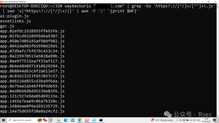 因此,当您运行此命令时,它将为你提供从waybackurls中提取.js端点列表和,同时排除域名。(将”site.com”替换为你想要的域)