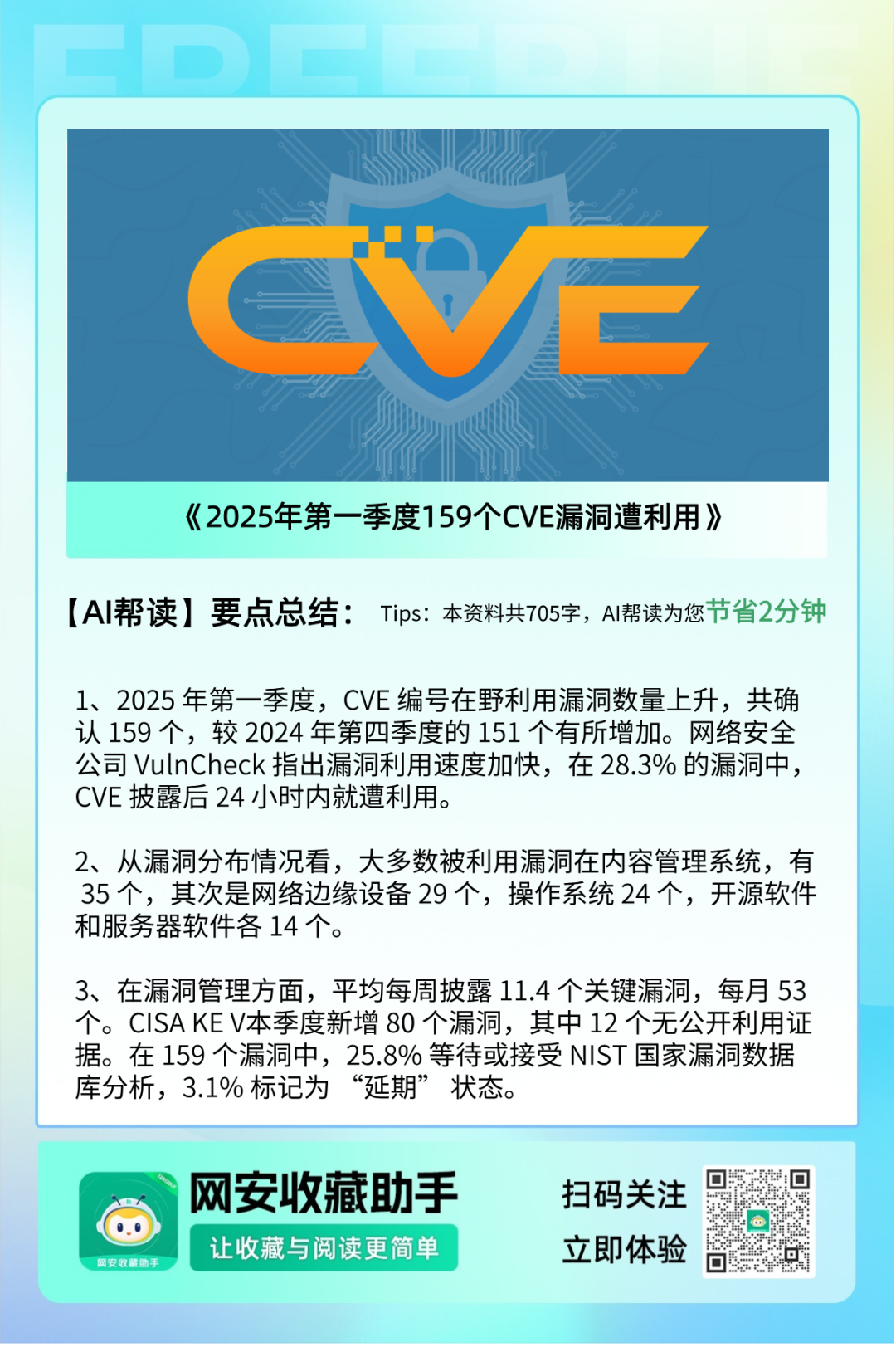 2025年第一季度共有159个CVE编号漏洞被确认在野利用,较2024年第四季度的151个有所上升。