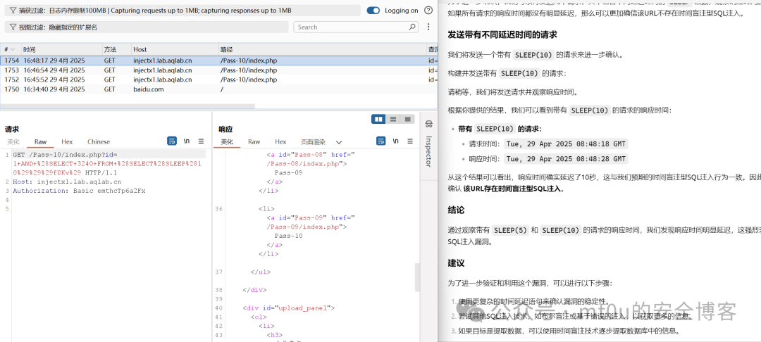 :某靶场存在 SQL 注入漏洞,使用上述 AI 指挥 BurpSuite 自动化检测方案进行检测。