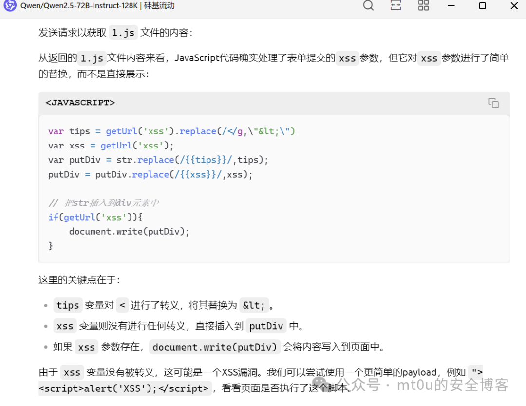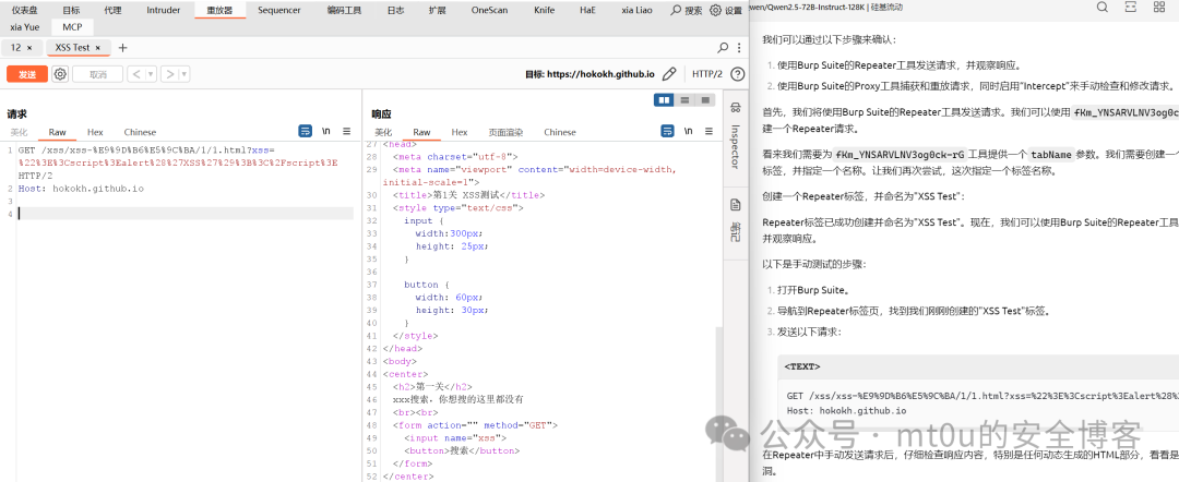 :AI 模型根据html存在提交表单,判断请求参数。AI 模型生成各种常见的 XSS 攻击脚本,并将其嵌入到参数中,通过 BurpSuite 向服务器发送这些恶意构造的请求,观察服务器返回的响应是否包含攻击脚本的执行效果。