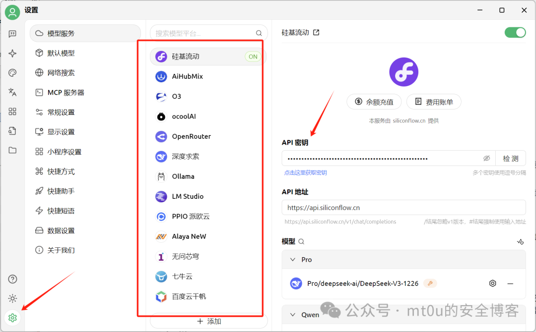 2. 安装 Cherry Studio 平台,配置AI的key并确保其正常运行,这里我用的硅基流动的api。
