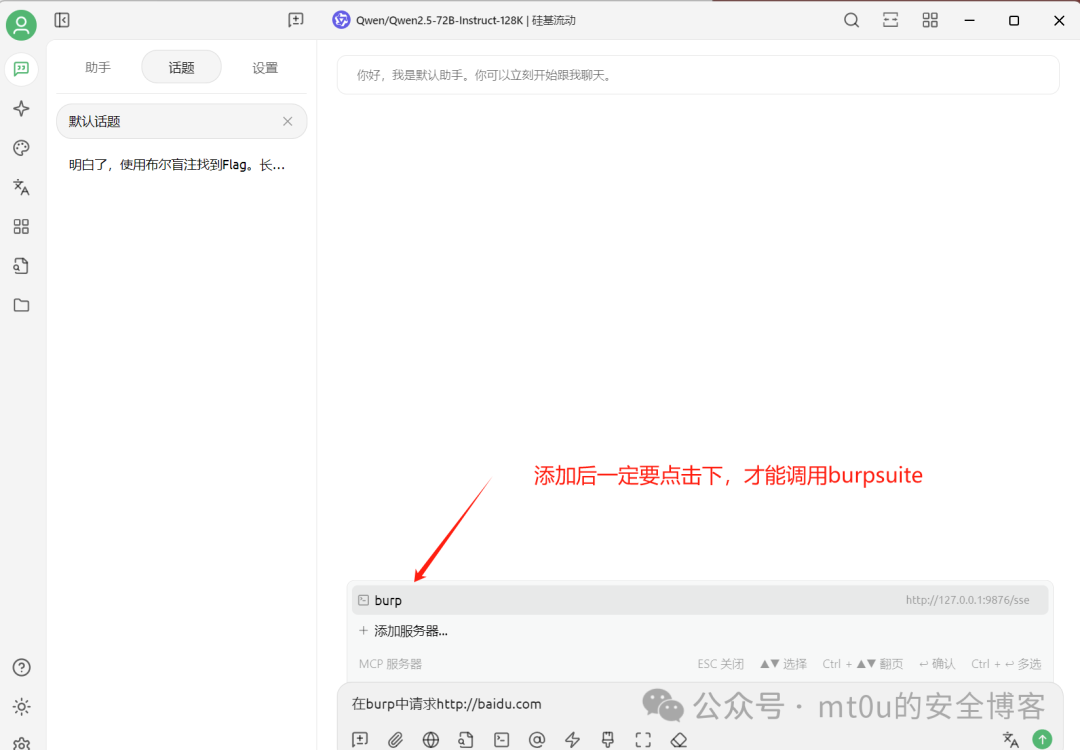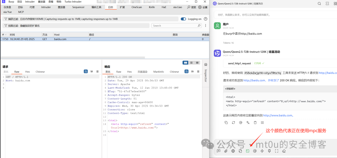 1. 测试 AI 模型与 MCP 服务之间的通信是否正常,通过发送简单的测试指令,观察 MCP 服务是否能够正确接收并转发给 BurpSuite。