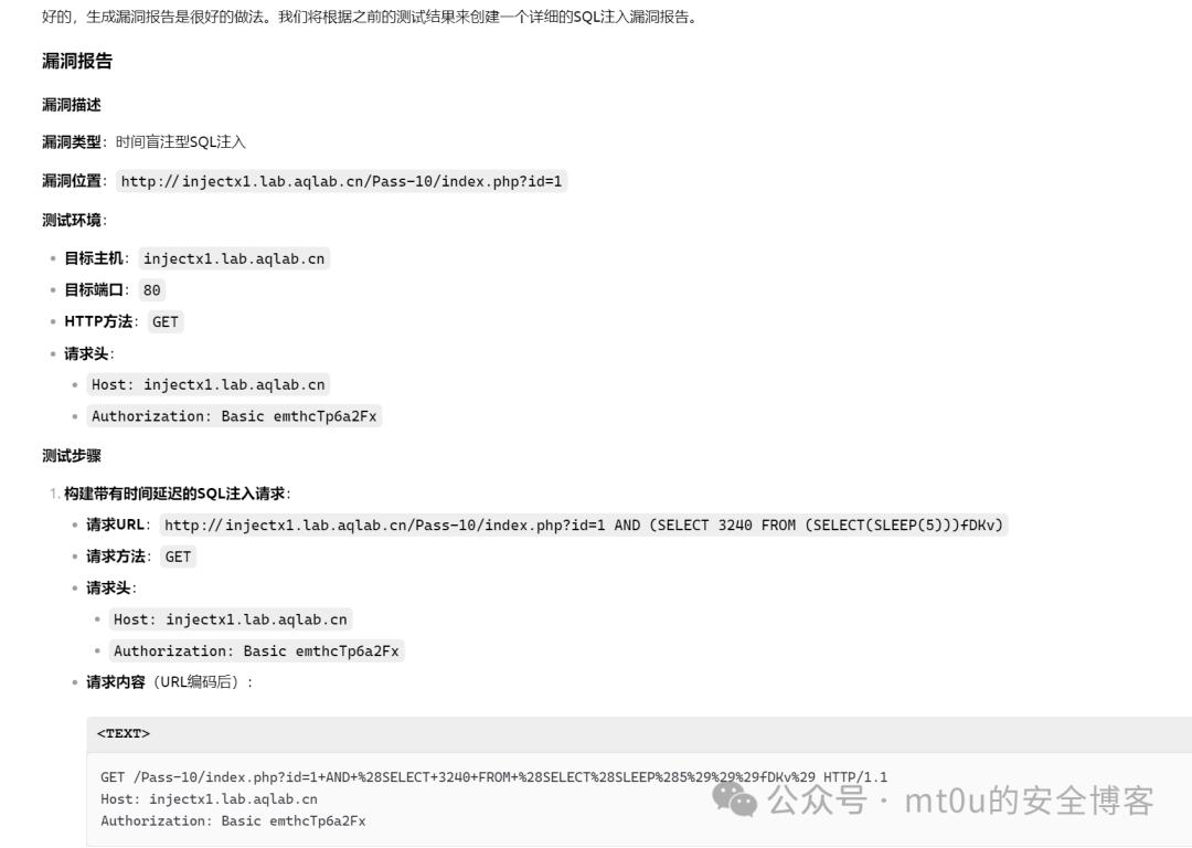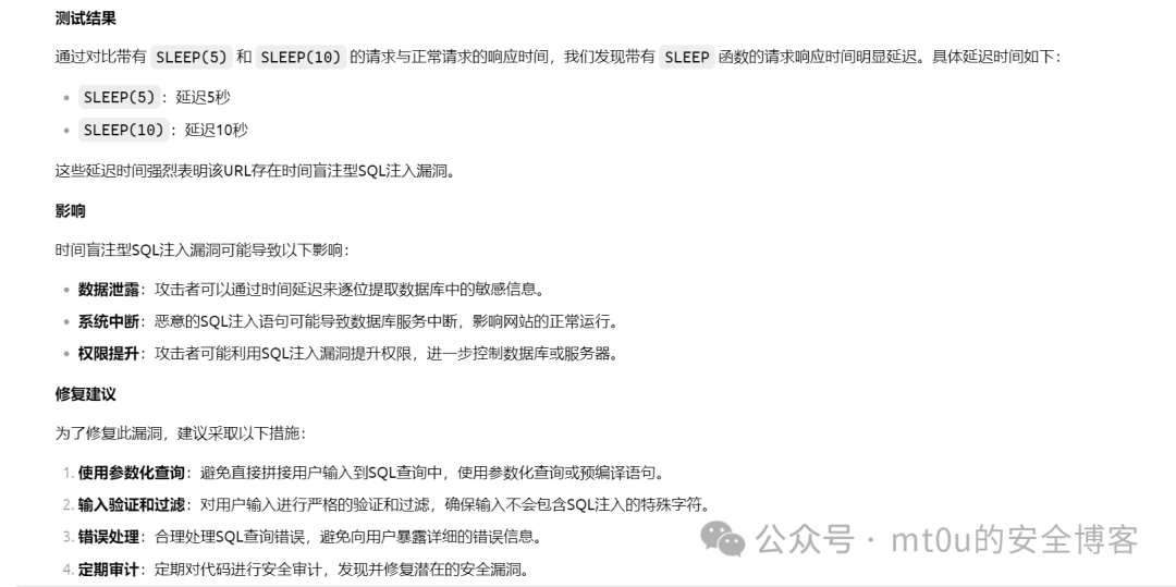 :在检测过程中,BurpSuite 成功发现可能存在 SQL 注入漏洞的页面参数和位置。AI 模型对这些结果进行分析,确定其中高危漏洞,并生成详细的漏洞报告,包括漏洞出现的页面路径、参数名称、测试用例、服务器返回的错误信息等具体内容,为开发团队修复漏洞提供了明确的指导。