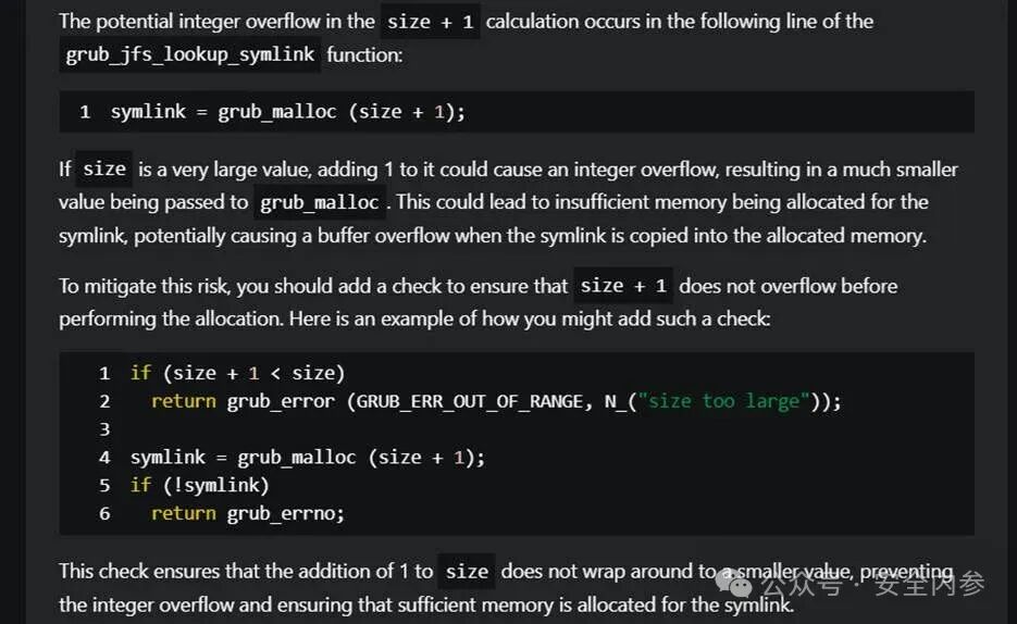 研究员利用Security Copilot成功地在其他GRUB2文件中识别了类似的漏洞模式。尽管存在误报的可能性,研究员还是对GRUB2进行了全面验证和审查,以确保没有遗漏任何问题,并确认了与整数溢出相关的其他漏洞。