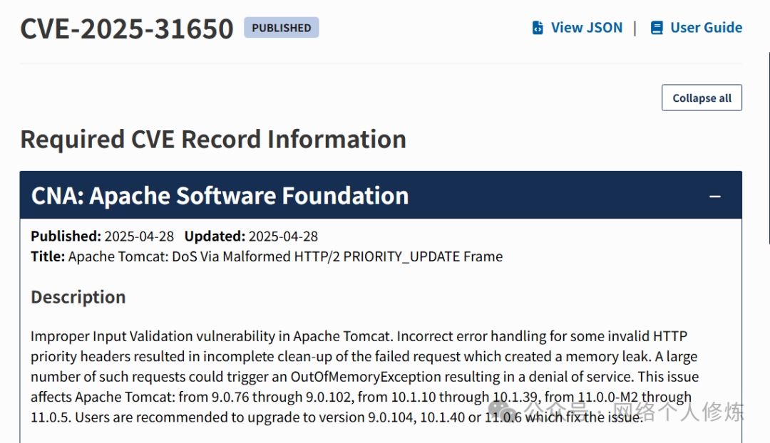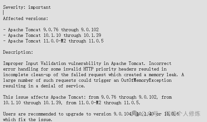 此漏洞存在于对 HTTP 优先级头部(HTTP/2 Priority Headers) 的错误处理过程中。当接收到格式错误的优先级头部时,Tomcat 并未正确清理失败请求,造成内存泄漏。攻击者可发起大量恶意请求,最终耗尽内存资源并触发 OutOfMemoryException,导致服务不可用(拒绝服务攻击 DoS)。