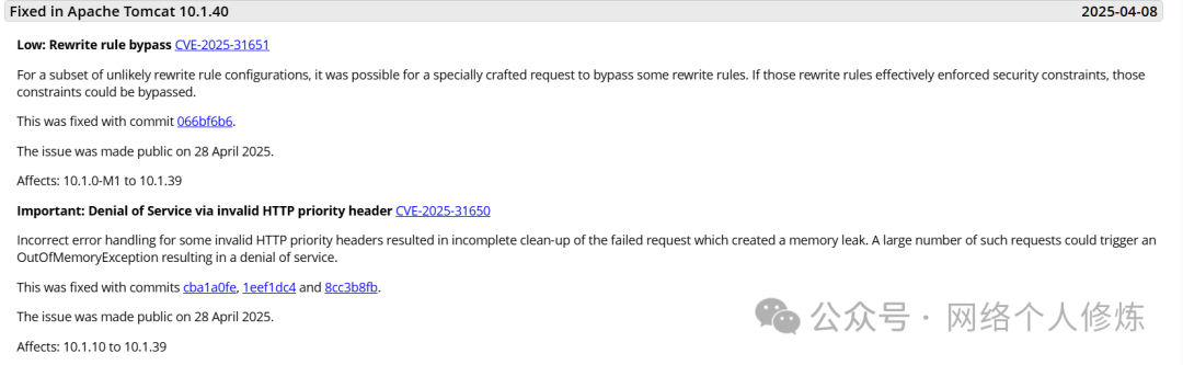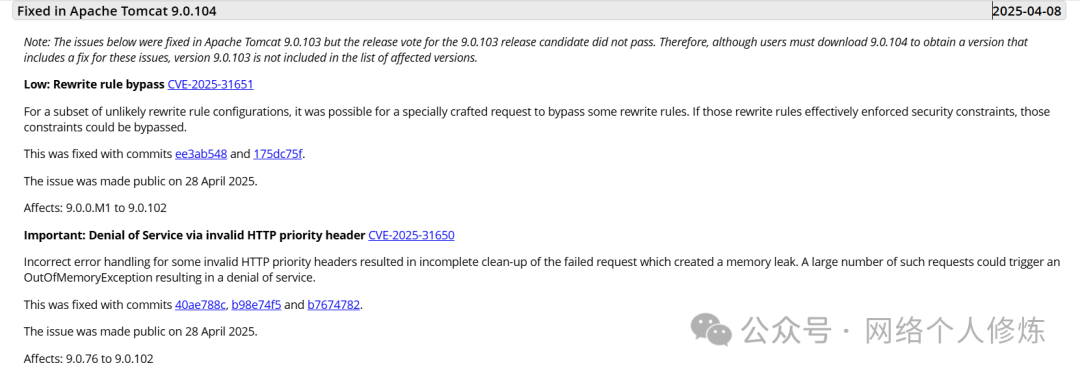 的安全更新,修复了两个关键的安全漏洞,分别被编号为 CVE-2025-31650 和 CVE-2025-31651。这些漏洞可能影响用户的应用服务器安全性,并导致拒绝服务(DoS)或安全策略绕过等风险。