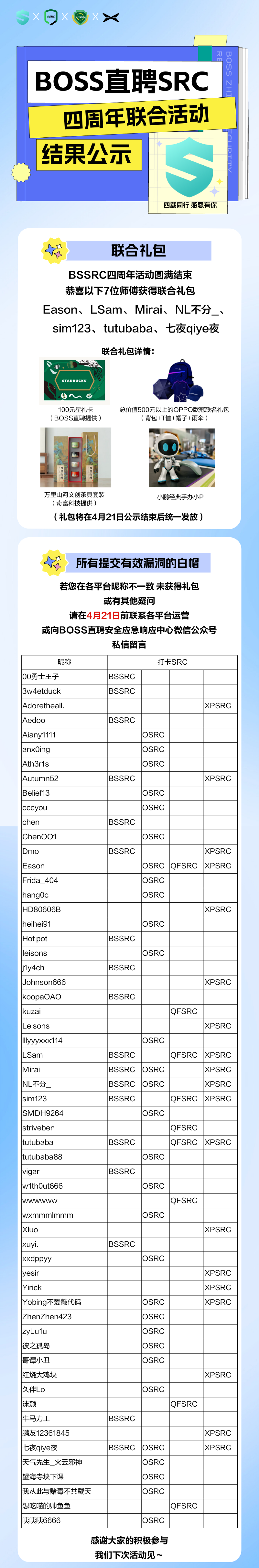 BSSRC四周年活动联合礼包结果公示 发布于2025年4月14日2025年7月19日 作者:cve-20 BSSRC四周年活动联合礼包结果公示 BOSS直聘安全应急响应中心 2025-04-14 10:02