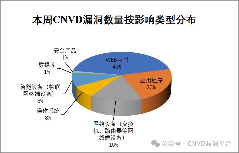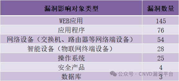 CNVD收录了335个漏洞。WEB应用145个,应用程序76个,网络设备(交换机、路由器等网络端设备)54个,智能设备(物联网终端设备)28个,操作系统25个,安全产品4个,数据库3个。
