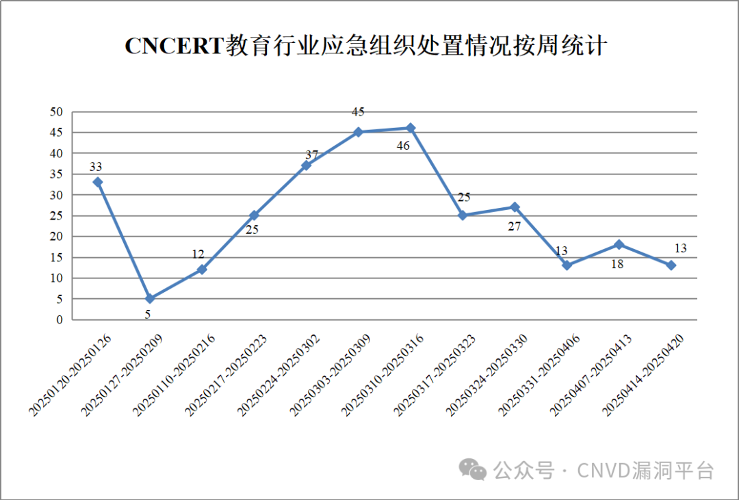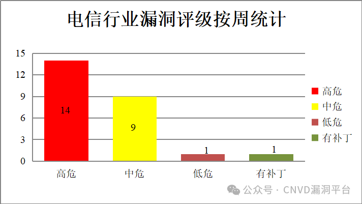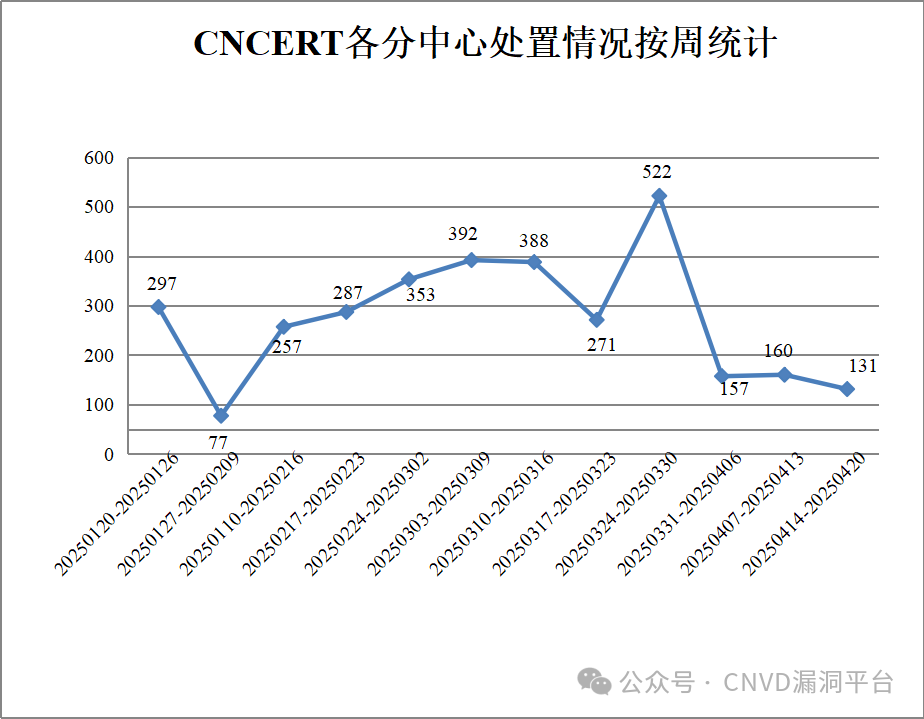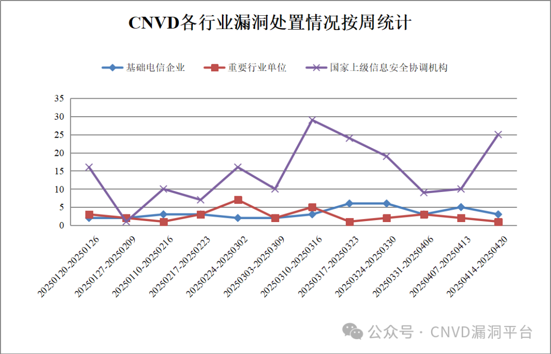 CNVD向银行、保险、能源等重要行业单位通报漏洞事件1起,向基础电信企业通报漏洞事件3起,协调CNCERT各分中心验证和处置涉及地方重要部门漏洞事件131起,协调教育行业应急组织验证和处置高校科研院所系统漏洞事件13起,向国家上级信息安全协调机构上报涉及部委门户、子站或直属单位信息系统漏洞事件25起。