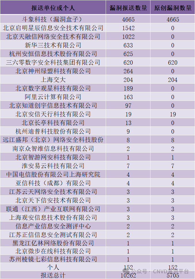 其中,北京启明星辰信息安全技术有限公司、北京天融信网络安全技术有限公司、新华三技术有限公司、杭州安恒信息技术股份有限公司、北京神州绿盟科技有限公司等单位报送公开收集的漏洞数量较多。淮安易云科技有限公司、中国电信股份有限公司上海研究院、亚信科技(成都)有限公司、江苏云天网络安全技术有限公司、北京天下信安技术有限公司、联通(江西)产业互联网有限公司、上海观安信息技术股份有限公司、信息产业信息安全测评中心、江苏正信信息安全测试有限公司、黑龙江亿林网络股份有限公司、北京微步在线科技有限公司、苏州棱镜七彩信息科技有限公司及其他个人白帽子向CNVD提交了5705个以事件型漏洞为主的原创漏洞,其中包括斗象科技(漏洞盒子)、三六零数字安全科技集团有限公司和上海交大向CNVD共享的白帽子报送5489条原创漏洞信息。
