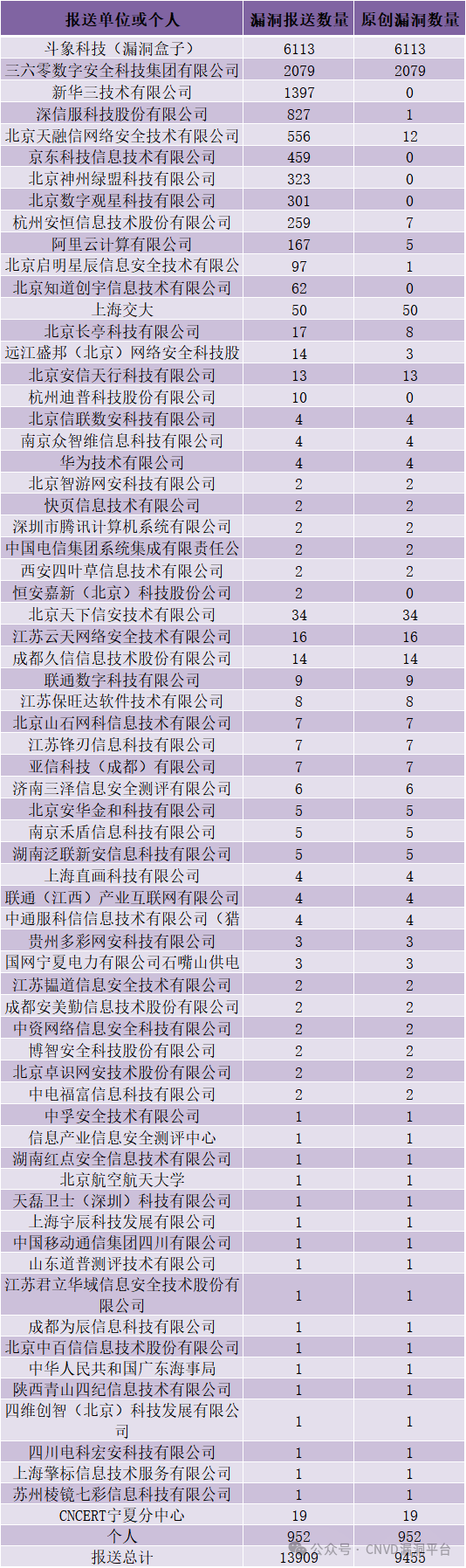 个以事件型漏洞为主的原创漏洞,其中包括斗象科技(漏洞盒子)、三六零数字安全科技集团有限公司和上海交大向