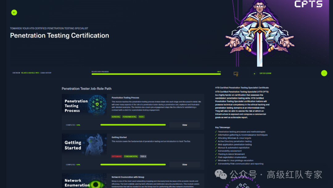 CPTS认证在考前是需要完成所有课程以及课后题(PATH)才可以约考的,因此打PATH算是考前必经之路,目前最新课程一共28个模块,每个模块下会有多个章节,课后题就在这些章节之中。