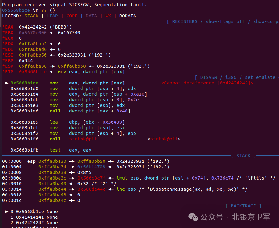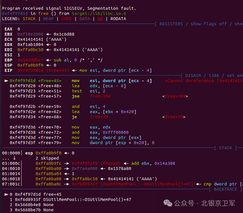 ,当覆盖为0x41414141的时候会导致无效指针释放。