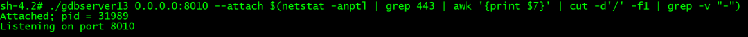 ./gdbserver13 0.0.0.0:8010 --attach $(netstat -anptl | grep 443 | awk '{print $7}' | cut -d'/' -f1 | grep -v "-")
