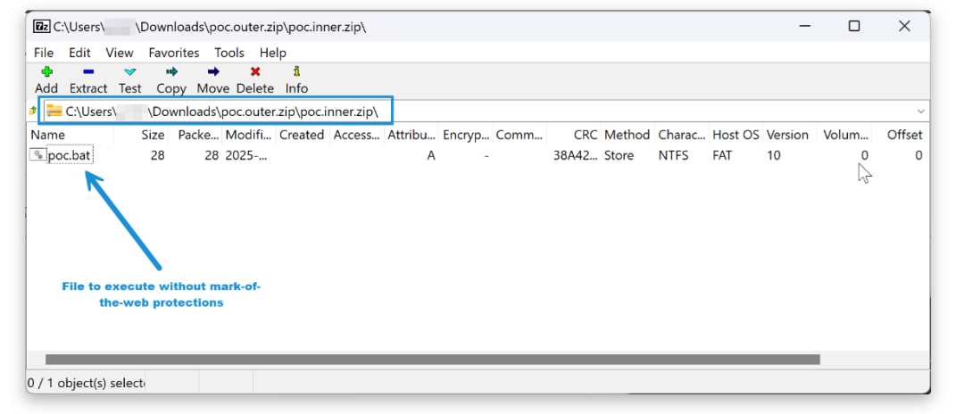 此图展示了 CVE-2025-0411 的 PoC 演示,其中一个 ZIP 存档嵌套在另一个 ZIP 存档中。在这个 PoC 中,嵌套存档