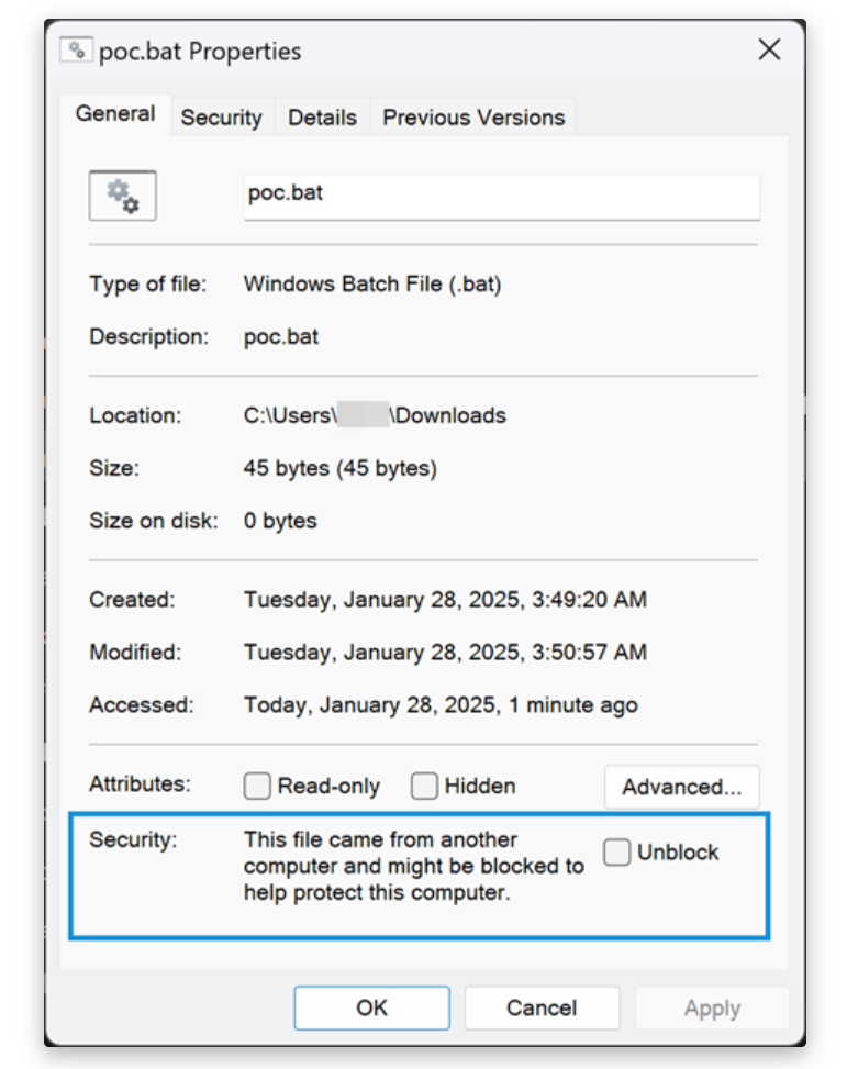 文件属性显示 MotW 标签信息如下(蓝色框)。当您运行带有此标签的文件时,会出现如上所示的警告弹出窗口。