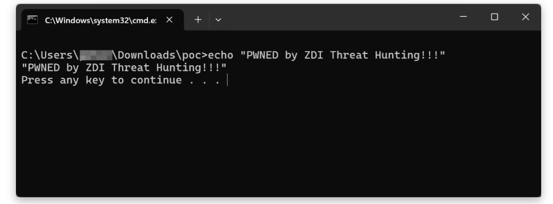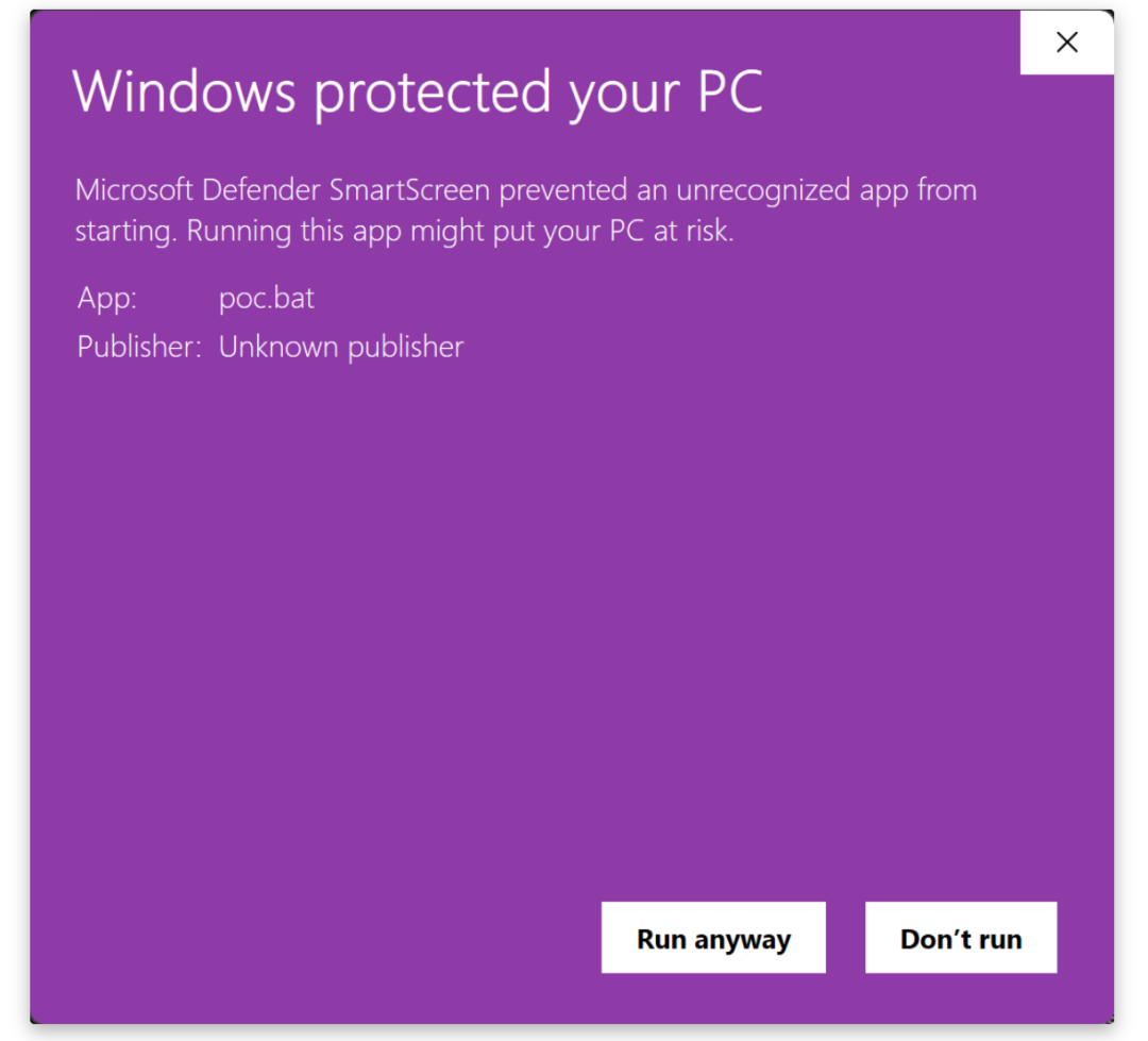(poc.outer.zip\poc.inner.zip)内的文件poc.bat没有 MotW 保护。缺乏保护大大增加了恶意软件感染的风险,并阻止 Windows Defender SmartScreen 正确检查文件的信誉和签名。如果你解压文件并运行它,则不会出现警告弹出,并且它将按如下方式运行。