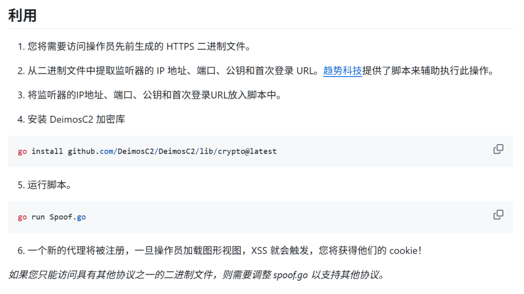 目前,“spoof.go”仅当监听器和代理都使用 HTTPS 协议时才有效,但是,如果经过调整,它可能会与 DeimosC2 支持的其他协议一起使用。