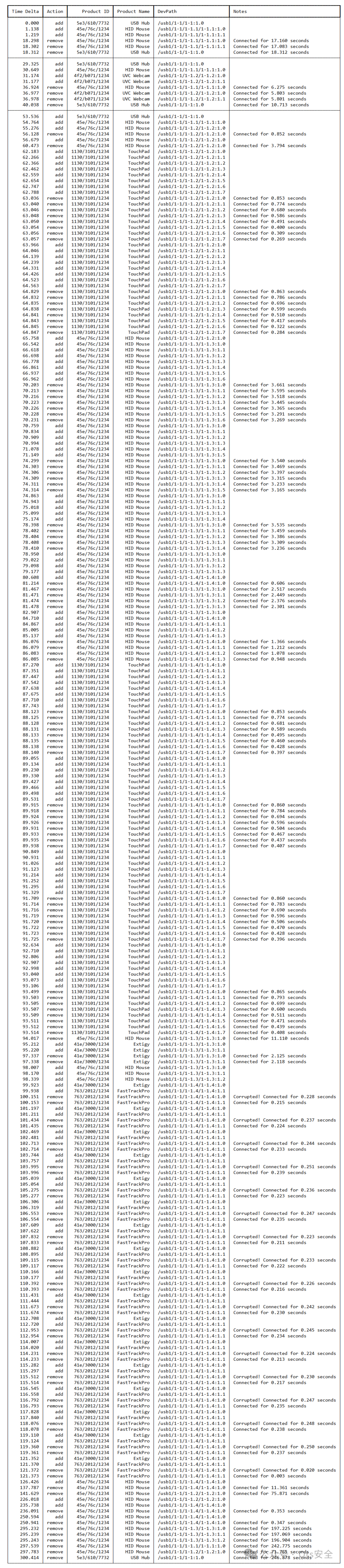 下表显示了在使用 Cellebrite UFED 漏洞利用青年活动家手机时观察到的每个 USB 连接和断开事件的轨迹。可以看到单独的利用流程,每个流程都以 USB 集线器设备的连接开始,以设备的断开结束。虽然在每个流程中都看到了一些设备,例如 HID 鼠标 (0x076c),但 UVC 网络摄像头 (0xb071) 和 Extigy 声卡 (0x3000) 分别只在第二和第三个流程中出现。