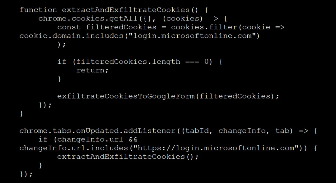 当登录发生时,它会读取所有作用域为“login.microsoftonline.com”的 Cookie,应用过滤以提取上述两个令牌,并通过 Google 表单将 Cookie 的 JSON 数据泄露给攻击者。
