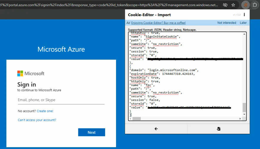 一旦cookie被盗,攻击者就会将其注入浏览器,就像其他被盗的cookie一样。这可以通过合法的Cookie-Editor Chrome扩展等工具来实现,该扩展允许威胁行为者将被盗的cookie导入到他们的浏览器“login.microsoftonline.com”下。