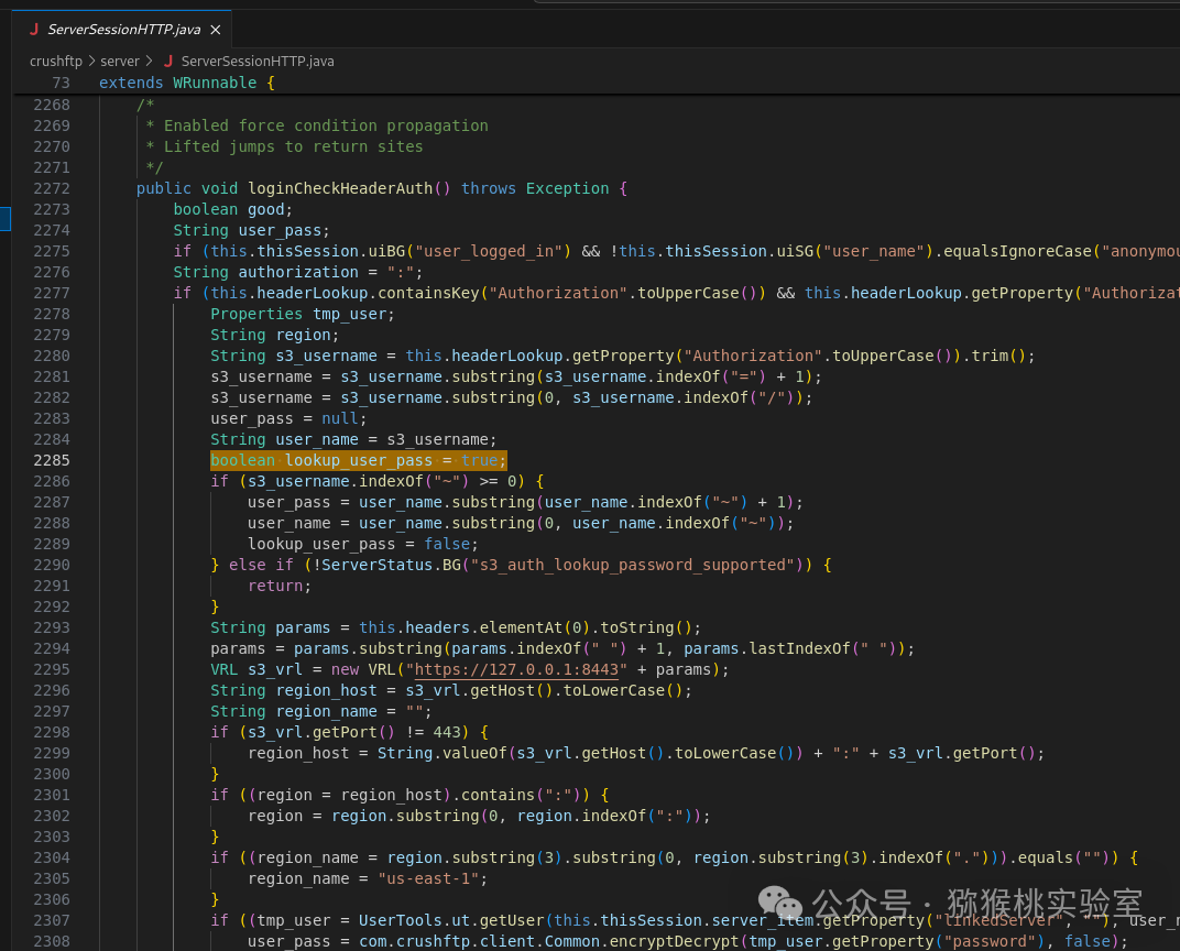 使用cfr反编译jar包后分析可知,这个漏洞的关键在于CrushFTP处理AWS S3认证头的逻辑中,一个名为lookup_user_pass