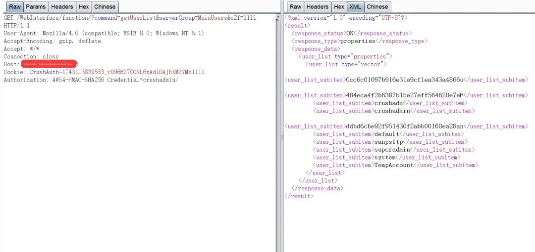 漏洞链接:http://xx.xx.xx.xx/WebInterface/function/?command=getUserList&serverGroup=MainUsers&c2f=1111
