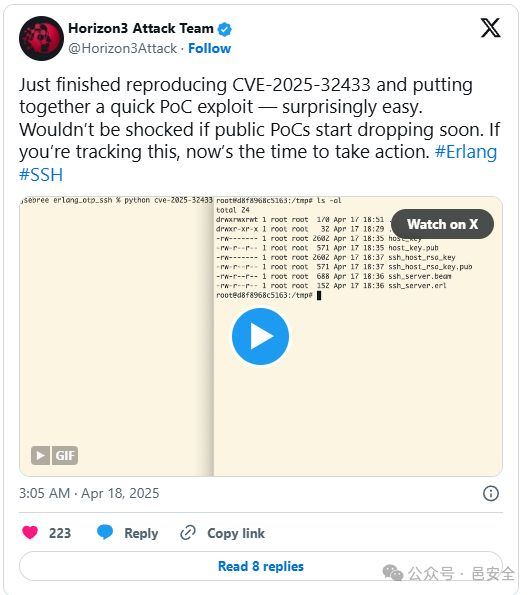 刚刚完成了 CVE-2025-32433 的重现并快速整合了一个 PoC 漏洞,非常简单。如果公共 PoC 很快开始下降,也不会感到震惊。如果您正在跟踪这一点,现在是采取行动的时候了,Horizon3 在社交媒体上发布了帖子。