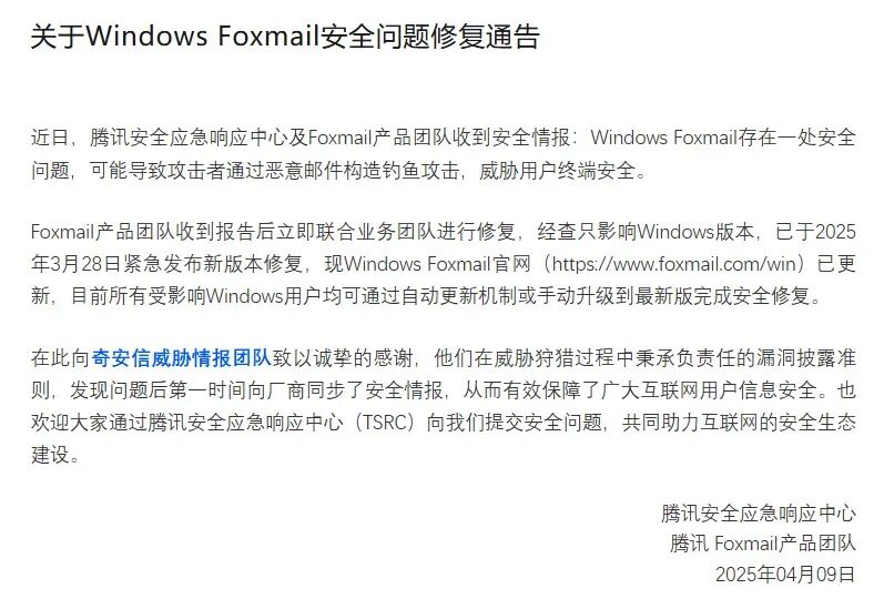 现 Windows Foxmail官网(https://www.foxmail.com/win)已更新,目前所有受影响 Windows 用户均可通过自动更新机制或手动升级到最新版完成安全修复。