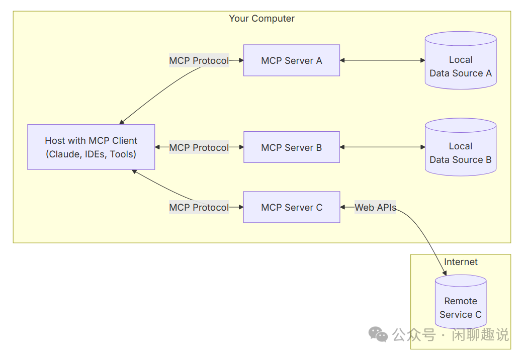 MCP协议的推出让大模型有了感知现实世界的能力,并且使用现实世界的工具并打通数据孤岛。下面是MCP协议架构(来源官网)