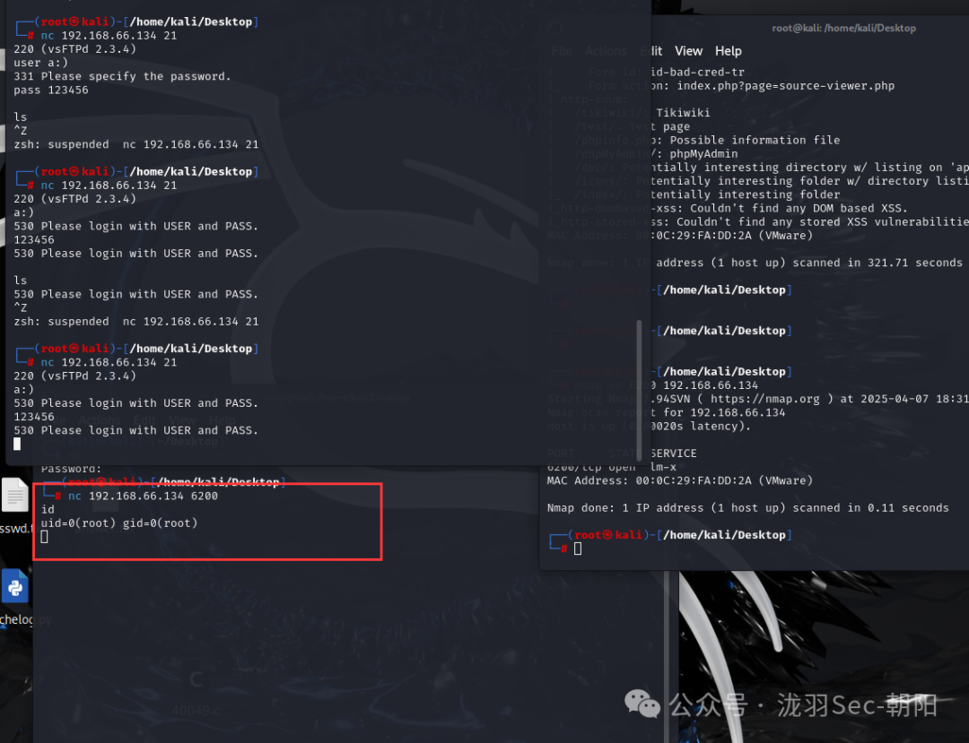 这里存在一个笑脸攻击,就是我们连接该ip的21端口时,我们将用户名输入后面加上“:)”笑脸的符号,然后扫描一下6200端口,再次连接到21端口即可提权成功为root用户