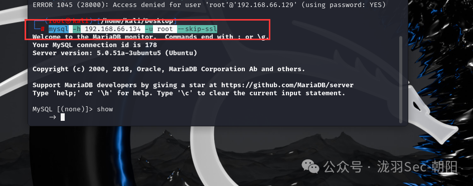 mysql -h 192.168.66.134 -u root –skip-ssl 是这样的,为什么加上后面参数,是因为靶机版本太低太低了,需要关闭这个服务,我们直接就登录到了mysql,信息随便看了